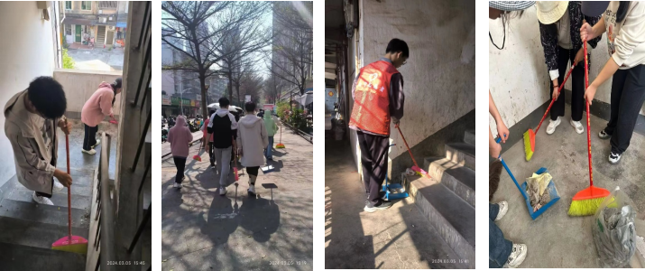 成员们签到后领取服装,在社区工作人员的带领下前往清洁地点。活动开始,连干分配清扫区域并进行工作分工,分发清扫工具,组织连员对地面、楼梯的卫生进行处理。大家迅速进入状态,各司其职、有序配合,高效率地进行清扫地面、打扫楼梯和清洁楼道灭火器等工作。大家忙碌不已,在劳动中体会奉献的意义,在汗水中收获帮助他人的快乐。经过志愿者们一个多小时的努力,楼栋及周边地区变得干净整洁。