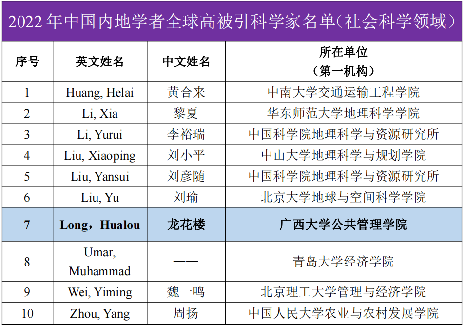 11月15日,科睿唯安(Clarivate)发布了2022年度全球“高被引科学家”(Highly Cited Researchers)榜单,来自全球69个国家和地区的6938名科学家入榜,其中,中国内地入榜1169人。太阳集团tyc138龙花楼教授入选社会科学领域的全球高被引科学家榜单(社会科学领域的内地学者本年度共有10名上榜)。入选“高被引科学家”榜单,说明该科学家论文被引频次在Web of Science™ 中位于同学科、同发表年份的前1%,体现了在同行之中卓越的学术影响力,为该学科领域的发展作出了卓越的贡献。龙教授2015-2021年连续7年入选Elsevier中国高被引学者,2019-2022年连续4年入选全球高被引科学家,受到国内外同行研究者高度认可与评价。