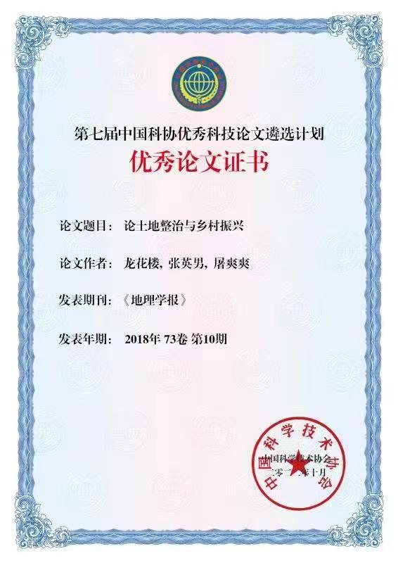 太阳集团tyc138龙花楼教授为第一作者于2018年10月在《地理学报》发表的“论土地整治与乡村振兴”一文获此殊荣。该文在基础研究前沿领域作出重要原始创新,对开拓和引领学科发展作出了重要贡献,目前在中国知网被引359次,下载13378次。