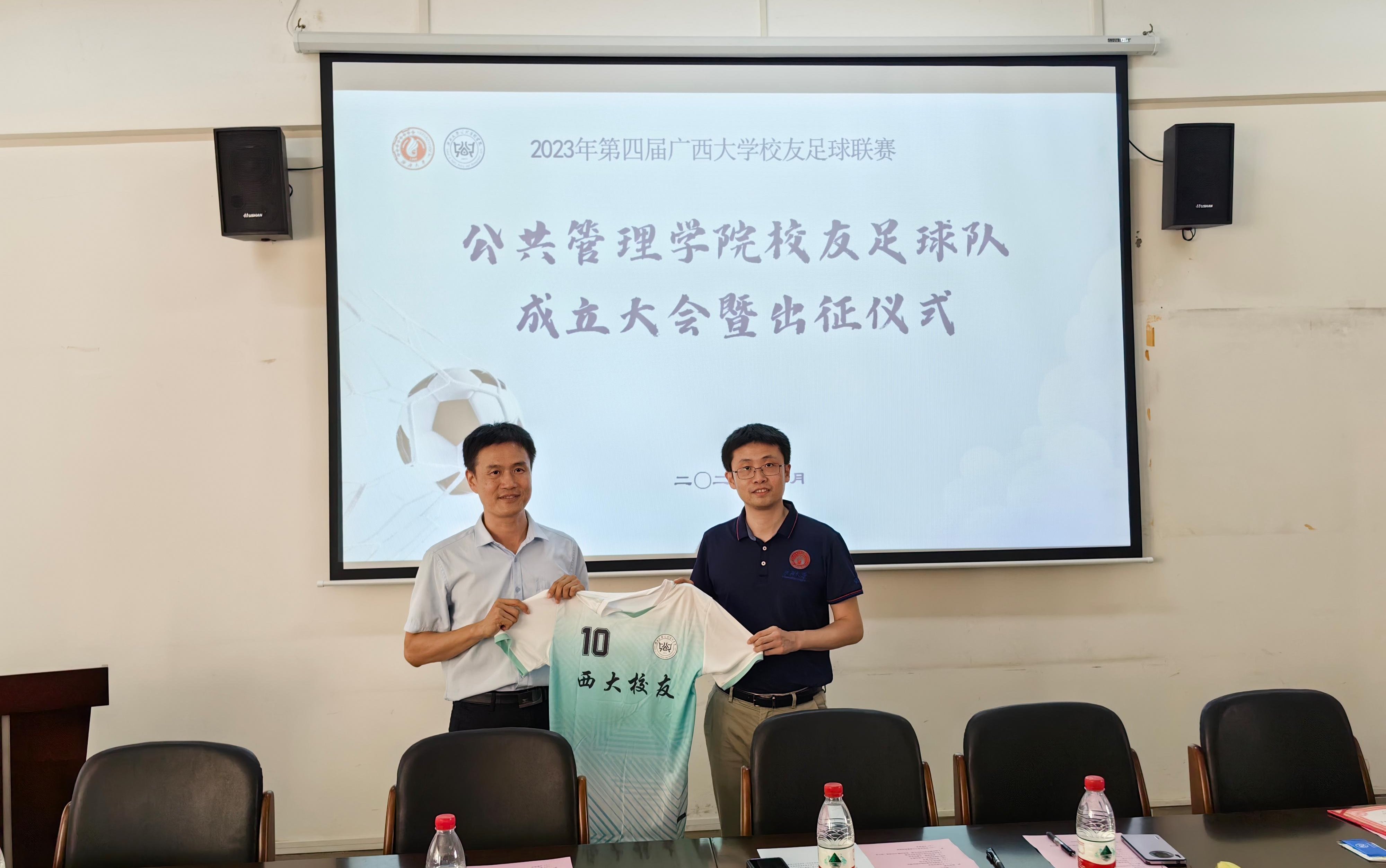 现就职于广西财经学院就业指导中心的校友代表哲学97级吴仕宇,就球队组建、球队组织构架、队员具体情况分别进行了介绍。他用三个起于和成在总结了球队组建的过程,即“起于兴趣,成在管理;起于初心,成在传承;起于跬步,成在千里”,表达了公共管理学子将专业培育的思维、知识和品质更好运用于社会,融入生活的态度。