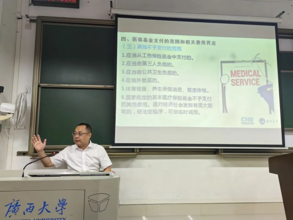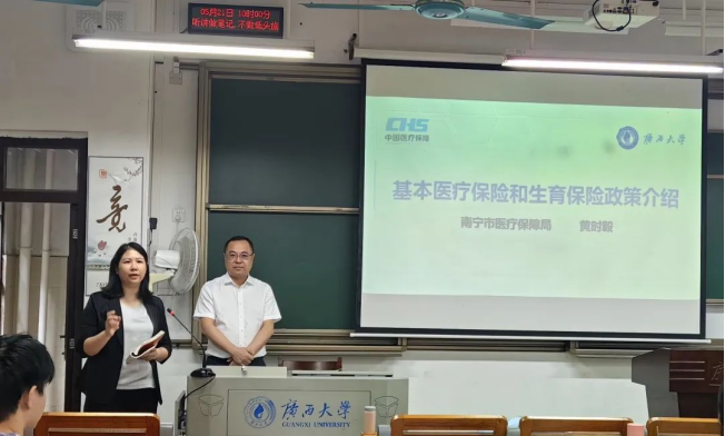 为创新性应用“政产学研”协同育人的教学模式,加强太阳集团tyc138学生对社会保障的认知,提升他们对基本医疗保险政策与生育保险政策的研读能力,5月21日和5月23日上午9:40至11:40在第六教学楼221和327教室,太阳集团tyc138老师吴凡主讲的课程《劳动法与社会保障法》邀请南宁市医疗保障局局长黄时毅为太阳集团tyc138学生讲解基本医疗保险和生育保险政策。