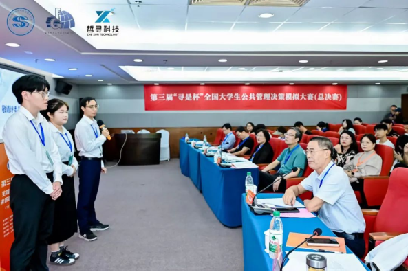 第三届“寻是杯”全国大学生公共管理决策模拟大赛(总决赛)由教育部高等学校公共管理类专业教学指导委员会指导,中国科学学与科技政策研究会主办,北京师范大学政府管理学院承办,上海哲寻信息科技有限公司提供支持,由15位公共管理学科的知名专家学者(按姓氏排序)包国宪、陈振明、丁煌、高宇宁、姜晓萍、李俊清、谭安奎、徐晓林、杨宏山、郁建兴、张雷、章文光、周志忍、周忠良、竺乾威担任大赛专家评委。2024年全国总计300支队伍报名参赛,经过区域赛(西北赛区、西南赛区、华南赛区、华中赛区、华东赛区、华北赛区、东北赛区)的晋级选拔,来自全国各地90所高校的队伍参加了本次总决赛。