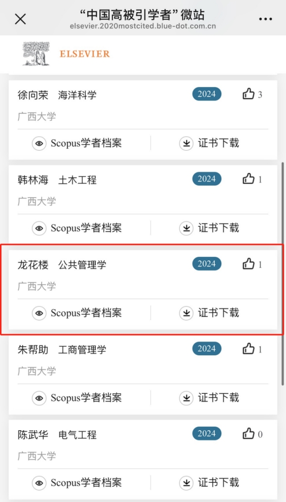 喜报|太阳集团tyc138龙花楼教授再次入选爱思唯尔“中国高被引学者年度榜单”