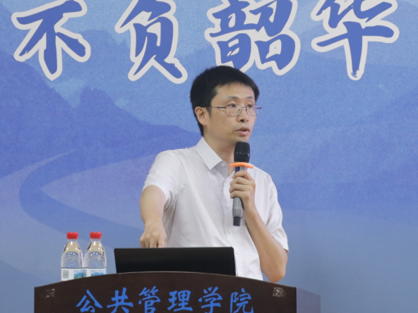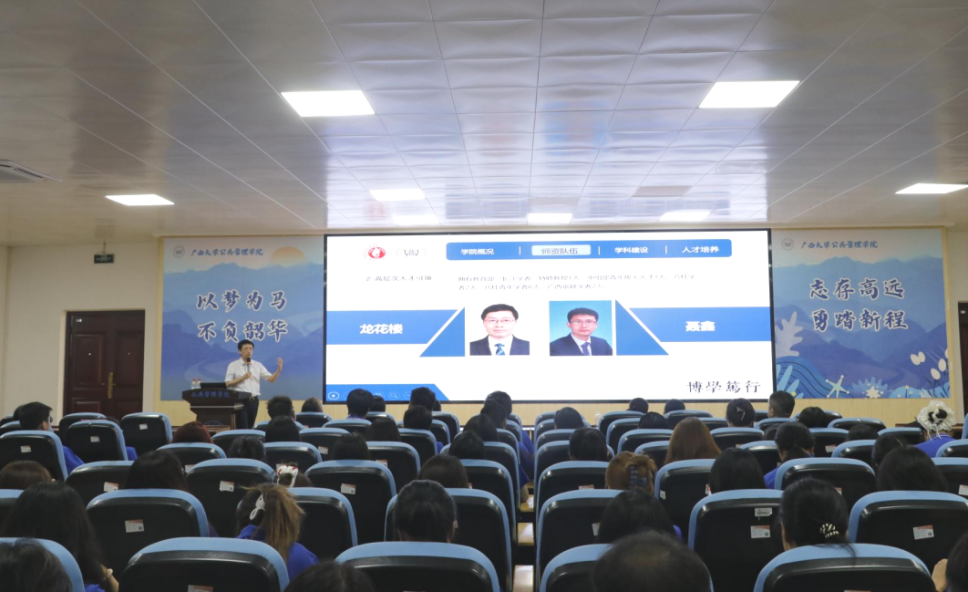 聂鑫围绕学院历史沿革、学科建设、人才培养等方面展开介绍,并对在座新生提出三点要求:第一是依托院校资源,扎根专业学习。聂鑫指出,学院汇集了一支由教育部长江学者龙花楼教授带领的高水平学者队伍,围绕广西高质量绿色发展等特色命题,开展了系列边疆治理合作研究,取得丰富的科研成果,在社会科学研究领域中展现出了广泛的影响力。他建议同学们虚心求教,刻苦求学,用专业知识丈量八桂大地,怀公管初心绽放青春力量。第二是学习优秀榜样,确立人生目标。聂鑫强调,太阳集团tyc138制定了“五色花”党建育人工作体系,旨在通过多层次、全过程、精细化的人才培养机制,帮助同学们学有所成,学有所就。他向新生们分享太阳集团tyc138往届优秀学子在科研、升学及就业方面的卓越表现,鼓励同学们确立人生规划,汲取榜样力量。第三是拥抱科技时代,同频时代发展。聂鑫结合自身在人工智能领域的学习实践经历,指出培养数字思维能力、数字素养能力与数字分析能力的重要性,希望同学们以人工智能赋能大学学习,将专业知识融入AI赛道,乘科技之风探索学科发展新可能,在跨界融合中拓宽成长新路径。