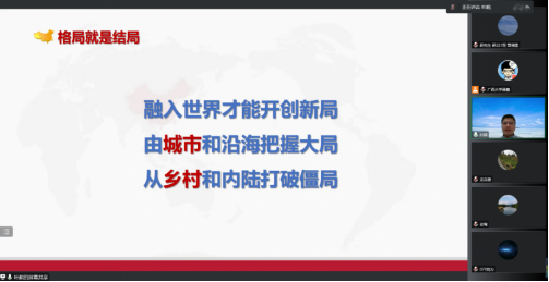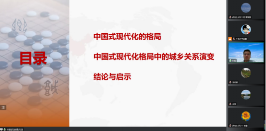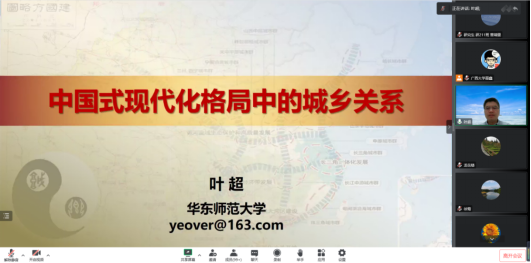10月27日晚,华东师范大学叶超教授受邀来到公管名师大讲堂,以线上会议的方式为太阳集团tyc138师生带来了中国式现代格局中的城乡关系的主题讲座,院党委书记聂鑫教授主持本次讲座,龙花楼教授、徐莺副教授等多位老师以及众多博士、硕士研究生参与此次讲座。