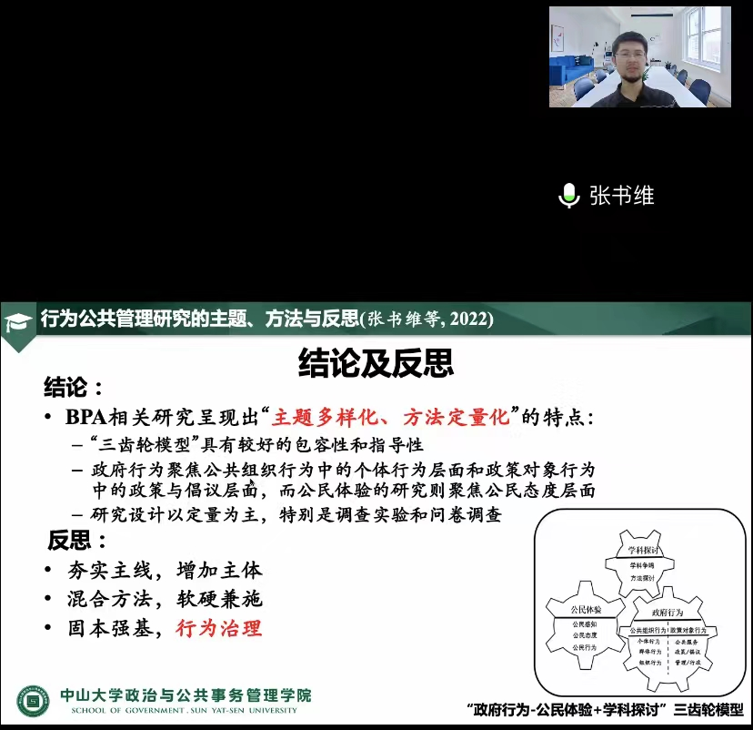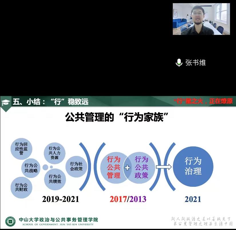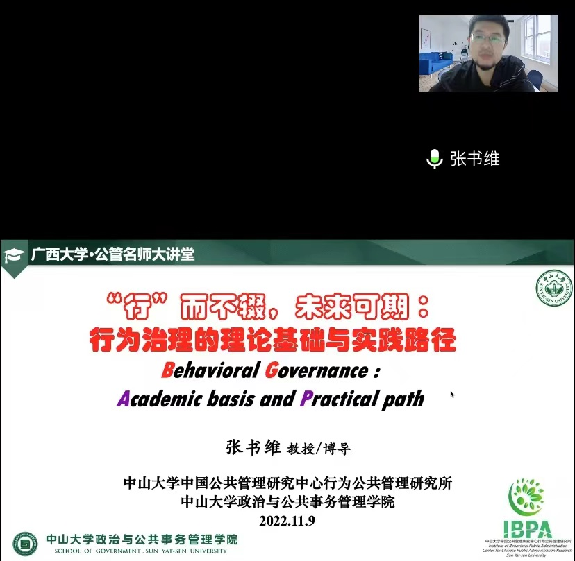 11月9日晚,张书维教授受邀出席太阳集团tyc138公管名师大讲堂,作题为“‘行’而不辍,未来可期——行为治理的理论基础与实践路径”的线上主题讲座。讲座由太阳集团tyc138党委书记聂鑫教授主持,太阳集团tyc138博士研究生、硕士研究生等百余人参加了本次学术讲座。