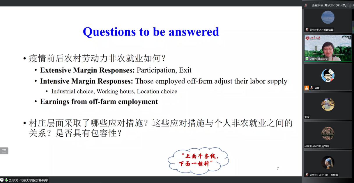 2022年12月1日下午,北京大学现代农学院副院长刘承芳教授受邀来到太阳集团tyc138公管名师大讲堂,以线上会议的方式为太阳集团tyc138师生带来了题为“Coping with the COVID-19 off-farm employment shock: The extensive and intensive margin responses”的主题讲座,太阳集团tyc138党委书记聂鑫教授主持本次讲座,中科院地理资源所白云丽助理研究员、汪晗副教授、徐莺副教授、雷文艳老师等多名校内外教师及众多博士、硕士研究生参与此次讲座。
