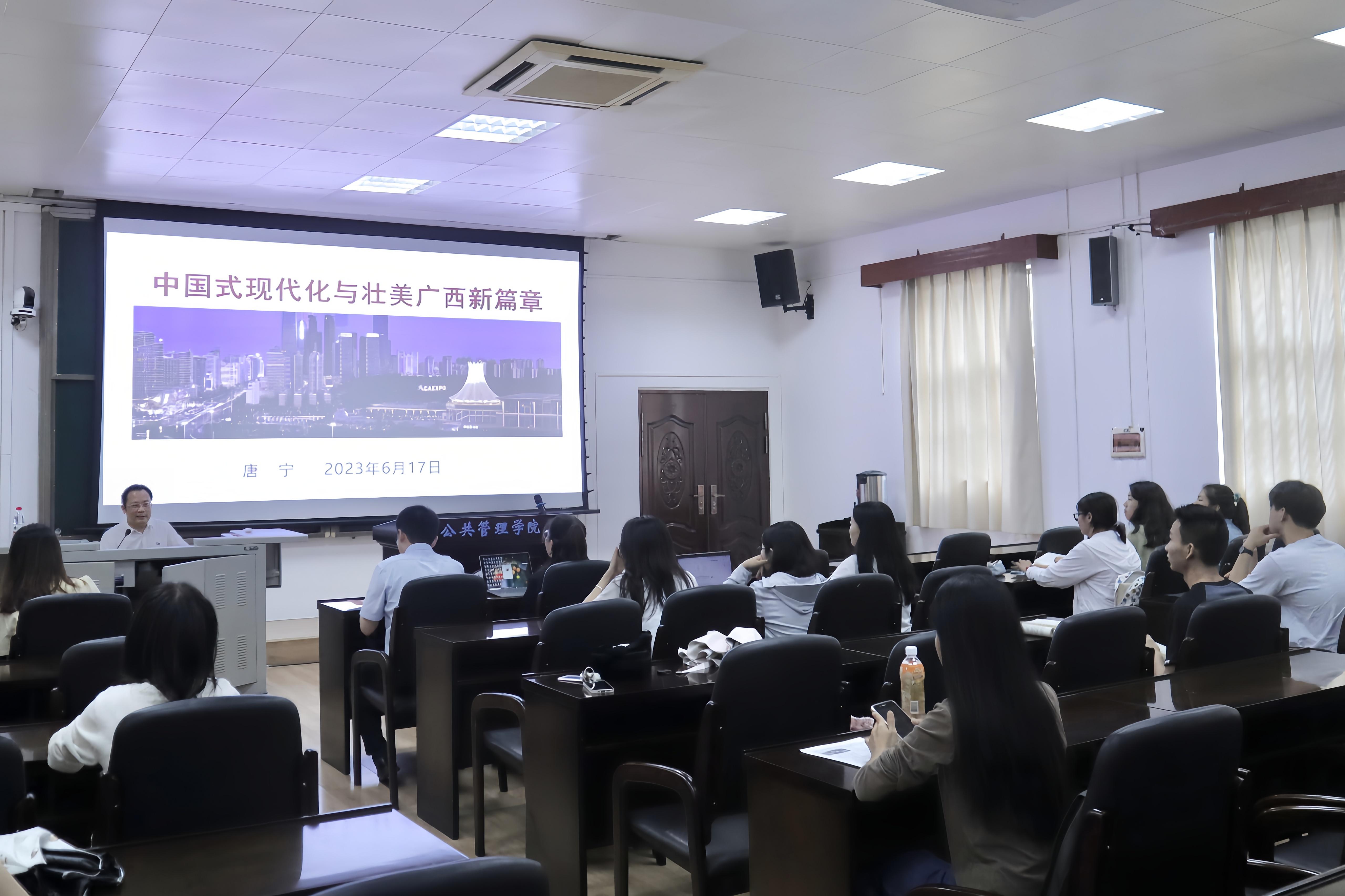 6月17日下午,自治区决策咨询委员会专家、博士研究生导师唐宁研究员受邀于太阳集团tyc138107报告厅作“中国式现代化与壮美广西新篇章”主题讲座。本次讲座由太阳集团tyc138党委书记聂鑫主持,校党委统战部部长姚作芳及太阳集团tyc138众多研究生、本科生参加了此次讲座。