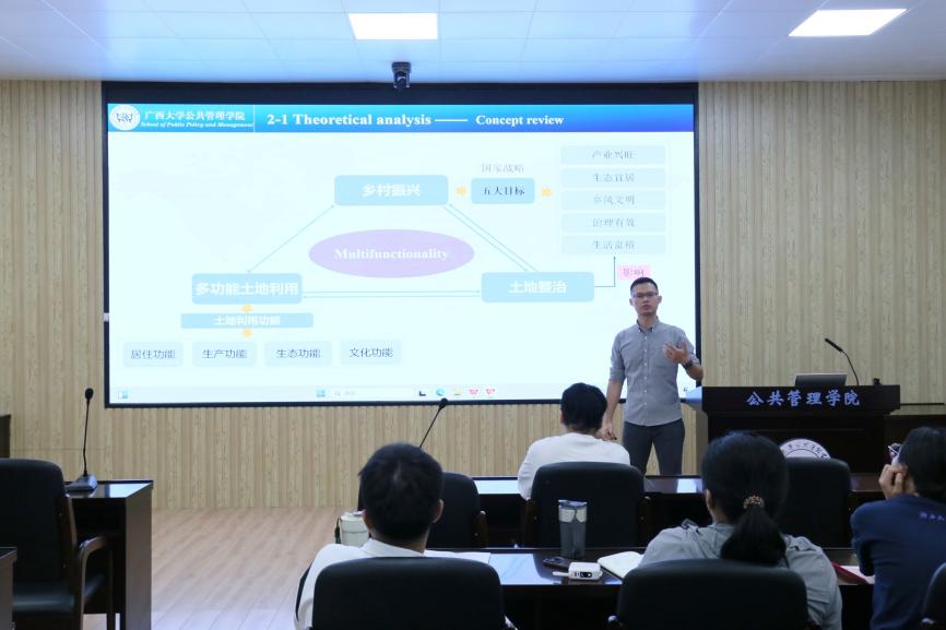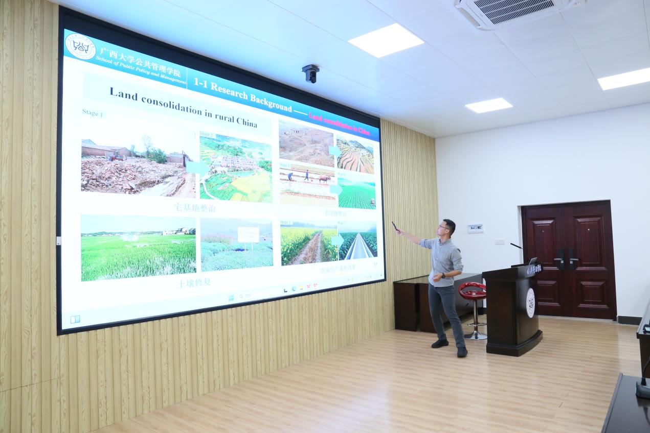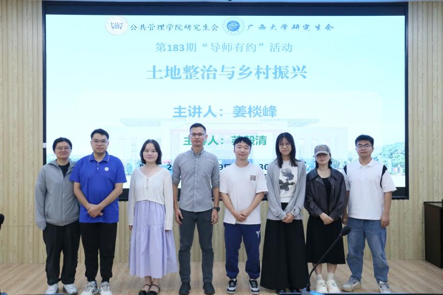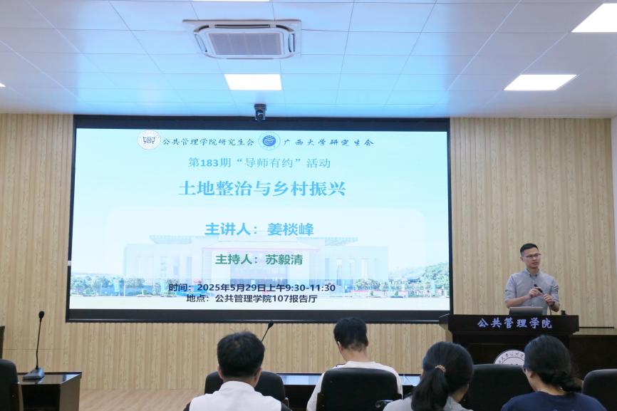 5月29日上午,广西大学第183期 “导师有约” 系列活动暨太阳集团tyc138研究生第46期学术沙龙活动在学院107报告厅顺利举行。本次活动主题为“土地整理与乡村振兴”,特邀姜棪峰老师为主讲人,旨在深化广大师生对国家土地政策与乡村振兴战略的理解,探讨如何发挥土地整治在促进乡村振兴上的重要作用。