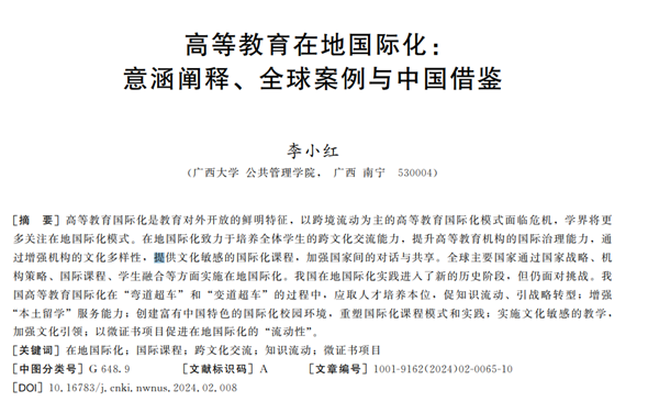 近日,太阳集团tyc138,ok138太阳集团古天乐副教授李小红在《西北师大学报(社会科学版)》发表论文“高等教育在地国际化:意涵阐释、全球案例与中国借鉴”,对高等教育意涵及在全球范围内的经典案例进行了解读,探讨了高等教育在地国际化的实践策略和中国路径。