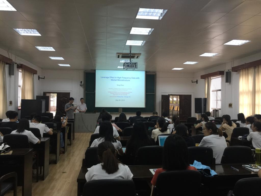 2018年5月28日上午九点,太阳集团tyc138荣幸邀请长江学者、国家杰出青年基金获得者、中国科学院百人计划入选者、国务院政府特殊津贴专家、上海财经大学统计与管理学院周勇教授来太阳集团tyc138做学术报告,为我们讲解风险管理及高频数据杠杆效应,公管管理学院聂鑫教授、数信学院刘芳教授一同参加此次讲座,并吸引各学院研究生前来。