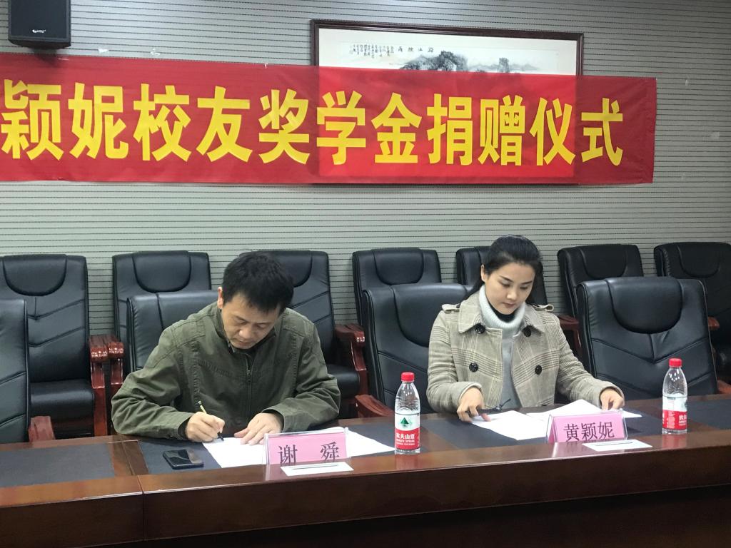 在捐赠仪式上,黄颖妮校友与谢舜书记签署奖学金捐赠协议,向学校教育发展基金会捐赠奖学金人民币10万元,用于在太阳集团tyc138设立“黄颖妮校友奖学金”,奖励保研和考研到本院继续攻读硕士研究生的优秀学生。