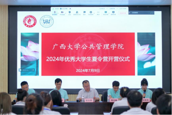 On the morning of July 9th, the 2024 “BoXue” Summer Camp for Outstanding Students, hosted by the School of Public Policy and Management at GXU, officially began. The opening ceremony was attended by Mr.Shi Yungui, Dean of the School, Vice Deans Mr.Zhou Junxu and Mr.Qin Zhimin, and Mr. Xiong Bin, Deputy Director of the MPA Education Center. This marks the sixth consecutive year the School has organized the “BoXue” Summer Camp, utilizing a hybrid “online and offline” format. Over 70 students from more than 40 universities across the country participated both virtually and in person.